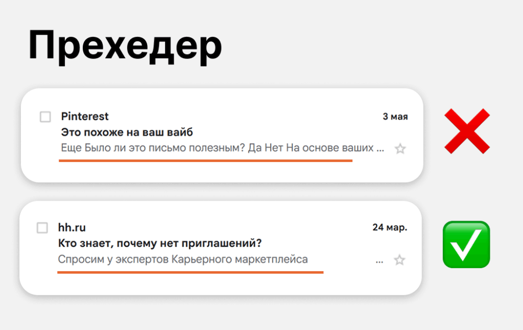 Прехедер работает в связке с темой и дополняет ее. Например, заголовок «Как копирайтеру вырасти в профессии» можно усилить прехедером «Даем пошаговый план и подборку материалов для обучения».