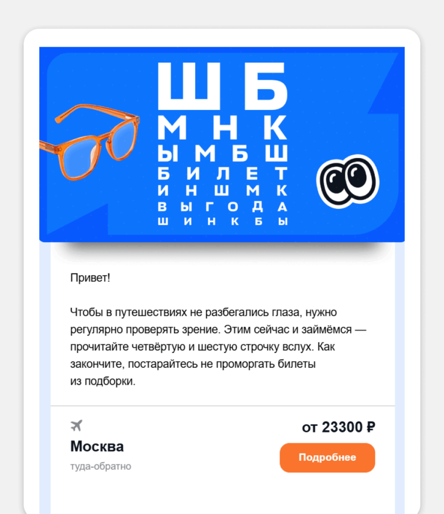 Что можно позаимствовать. Авиасейлс делает рассылку сразу в нескольких форматах, среди них: дайджест с полезными статьями о туризме, ответы на вопросы читателей, подборки недорогих билетов. Так контент работает на разные этапы воронки: от вовлечения до прямой продажи. Благодаря шутливому tone of voice и яркому дизайну письма лучше запоминаются, а еще каждую рассылку можно оценить с помощью эмодзи. Так появляется взаимодействие с аудиторией.
