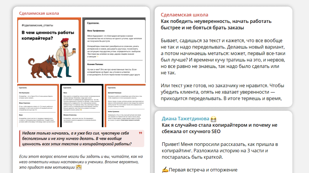 В канале сотрудники школы рассказывают, как создавать контент, получать заказы, вести переговоры, обмениваются мнениями и даже спорят друг с другом. Подписывайтесь, если работаете с текстами, будет полезно для насмотренности. Вот примеры постов: