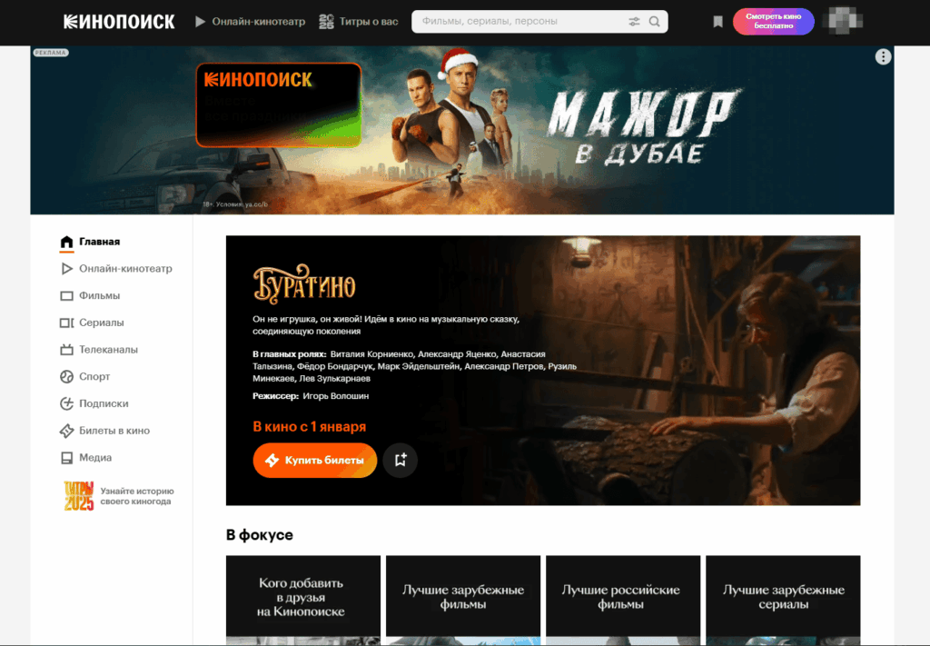 Веб-сервис или веб-приложение. Это не просто сайты, а программы с функционалом, например, «Кинопоиск». Задача первой страницы — показать, чем можно заняться на ресурсе. Например, выбрать места и купить билеты в театр, оформить подписку на онлайн-кинотеатр, найти авиабилет.