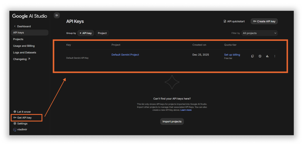 - Нажмите «Get API Key» и создайте ключ.