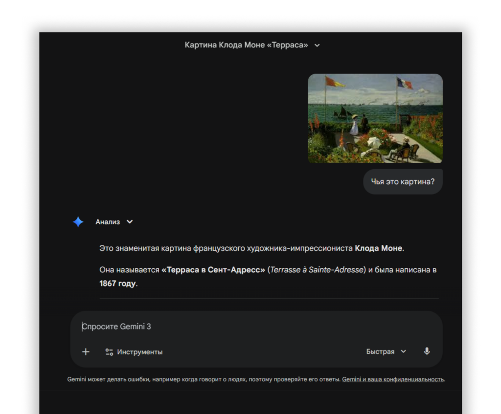 Когда пригодится: если нужно быстро создать визуал для поста, подготовить макет обложки или проанализировать дизайн конкурентов. Или если работаете с большим количеством скриншотов и документов — Gemini поможет извлечь из них текст и структурировать информацию.
