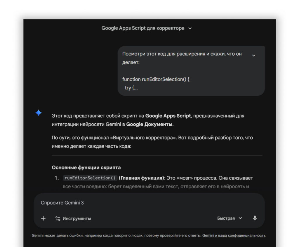 Когда пригодится: если нужно быстро написать скрипт для автоматизации задачи, разобраться в коде коллеги или создать API-документацию для команды. Например, Gemini может взять функцию на Python и написать к ней понятное описание с примерами использования.