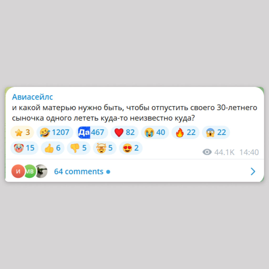 Иногда можно сделать виральный контент без сложного дизайна и съемок видео. Текст тоже может вызывать улыбку и желание поставить лайк. Пример — короткие шутки в ТГ-канале Авиасейлс собирают тысячи реакций.