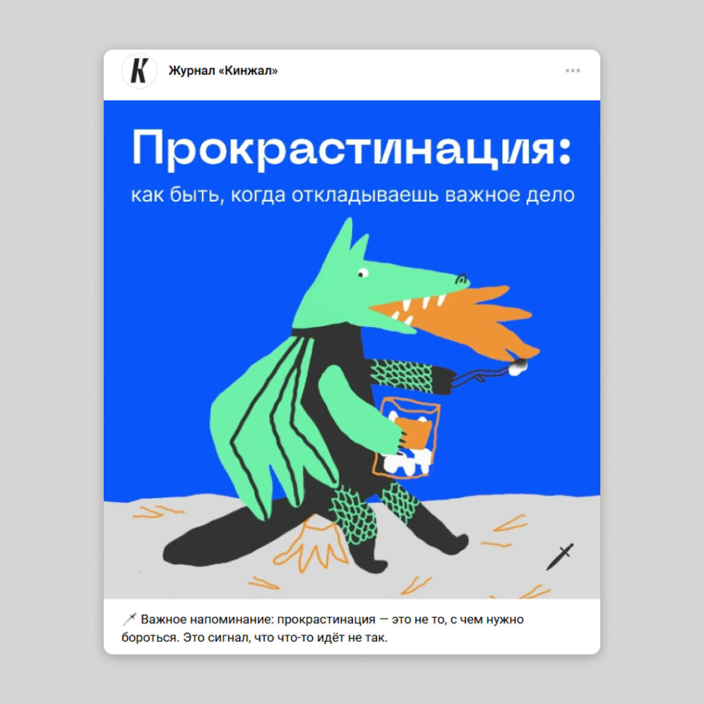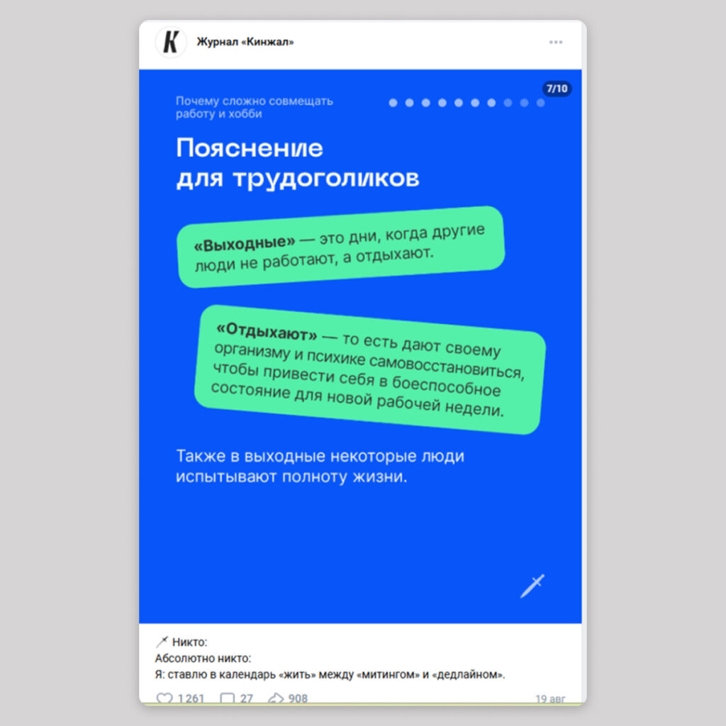 Пост журнала «Кинжал» о том, почему сложно совмещать работу и хобби. Иллюстрированные карточки собрали больше тысячи лайков — людям нравится, что их не осуждают за «недостаточно активный» образ жизни и нехватку свободного времени.