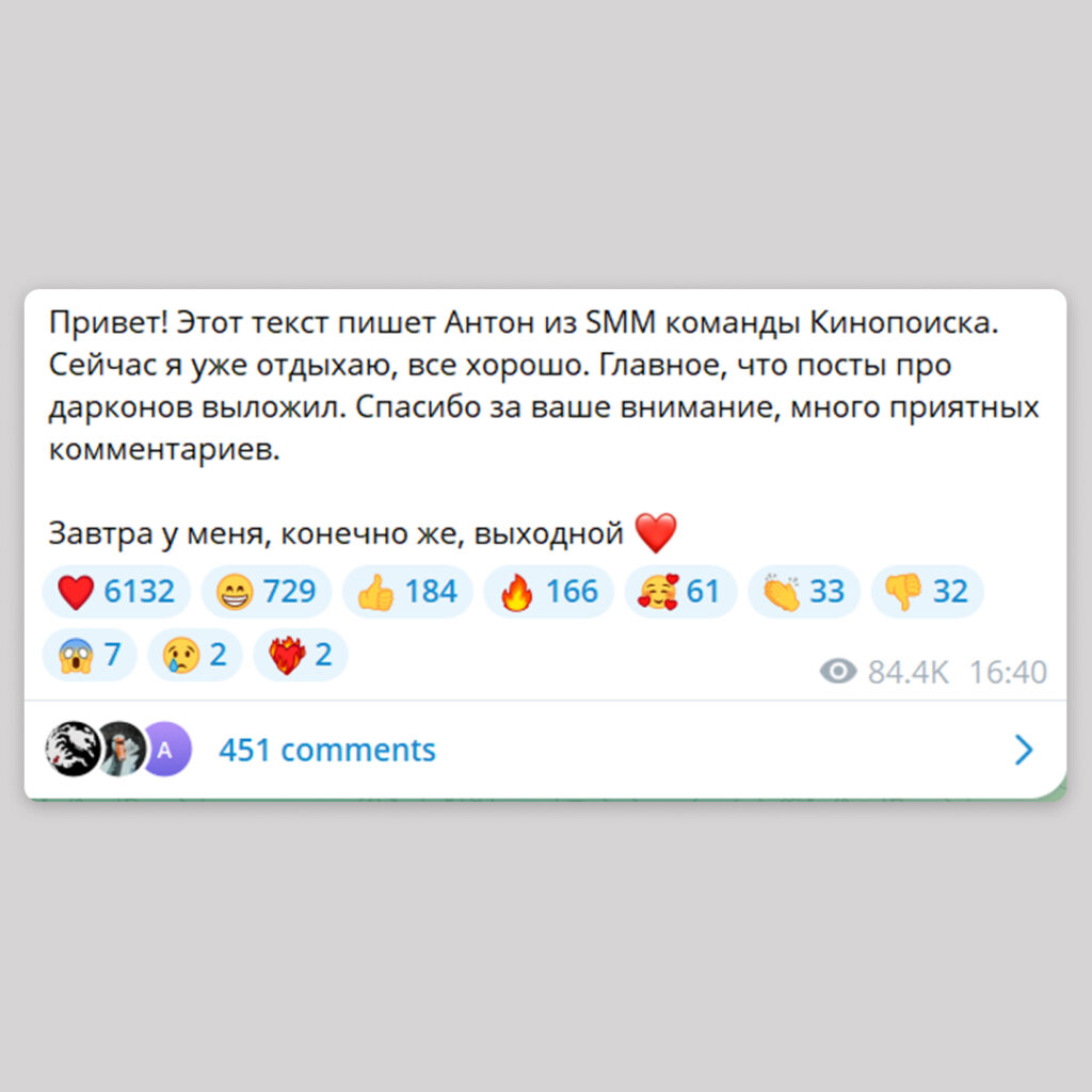 Шутка про «дарконов» в ТГ-канале Кинопоиска. В 2022 году в официальном ТГ-канале Кинопоиска из-за ошибки появилась переписка с SMM-сотрудником о выходе сериала «Дом дракона». Пост с записью «Антон, дарконы вышли ***** [публикуй] посты» быстро удалили, но фраза успела стать мемной — сработал эффект неожиданности, людям понравилась смешная опечатка и неформальный тон сообщения. Компания удачно обыграла ошибку в своем контенте: в следующих постах опечатка «дарконы» делалась намеренно.