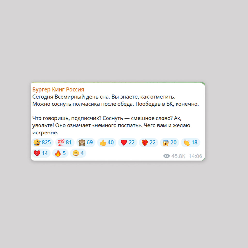 Пост Бургер Кинг о Всемирном дне сна. Провокационная игра слов от бренда собрала более 800 реакций — для сравнения на многих других постах их около 300.
