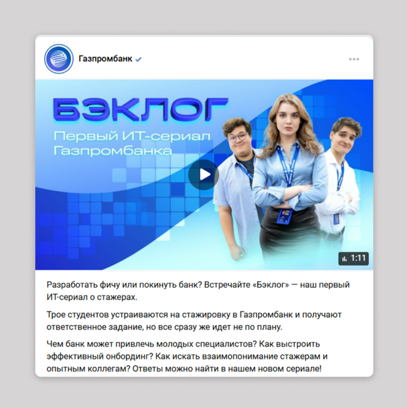 Сделайте что-то необычное. Привлекайте внимание: сейчас в тренде закреплять петличку микрофона на кухонных приборах, упаковке с косметикой и других предметах — выглядит странно, но оригинально. Можно снимать не только короткие видео, но и длинные форматы: например, Газпромбанк снял юмористический ИТ-сериал о студентах.