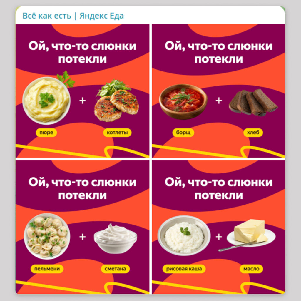 Попадайте в боли аудитории. Анализируйте, что нравится людям. Сейчас в соцсетях популярны видео о различиях между зумерами и миллениалами: можно взять эту тему, пока она актуальна. Можно пойти по классике и сыграть на ностальгии, воспоминаниях из детства. Например, Яндекс Еда постит шутки про пюрешку с котлеткой и сосиску в тесте из школьной столовой.