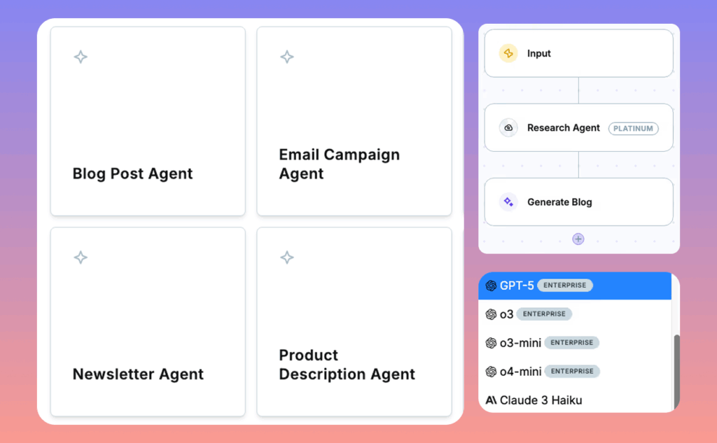 Это платформа ИИ-агентов, созданная специально для работы в маркетинге. В ней есть готовые боты для написания постов, email-рассылок, лендингов, лонгридов. Поможет, если не хотите самостоятельно возиться со сложными промптами — разработчики обучили нейросети, поэтому их ответы сгодятся как черновик для дальнейшей работы.