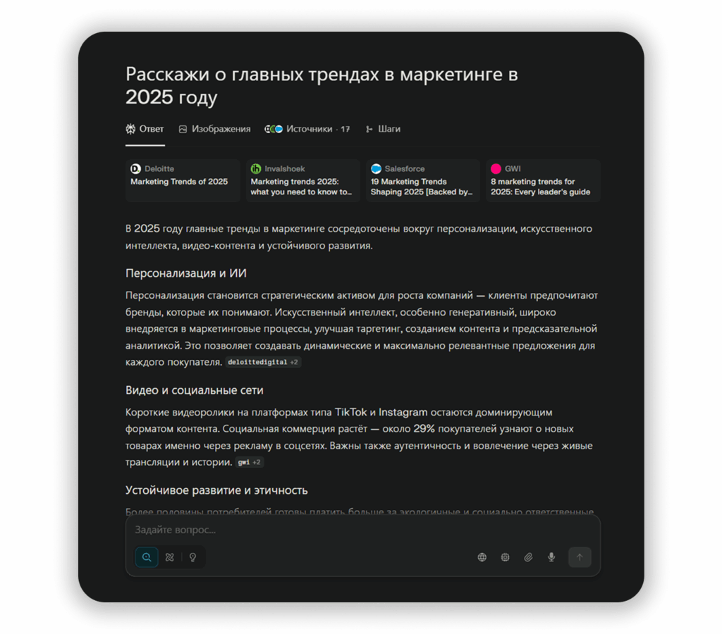 Чем поможет в работе с контент-планом. Perplexity пригодится, если нужно опираться на актуальные инфоповоды и тренды. Например, вы специалист по SMM и работаете на охваты. Тогда можете спросить нейросеть: «Какие главные темы в сфере N обсуждают осенью 2025?». В результате Perplexity выдаст список трендов и ссылки на публикации с инфоповодами.