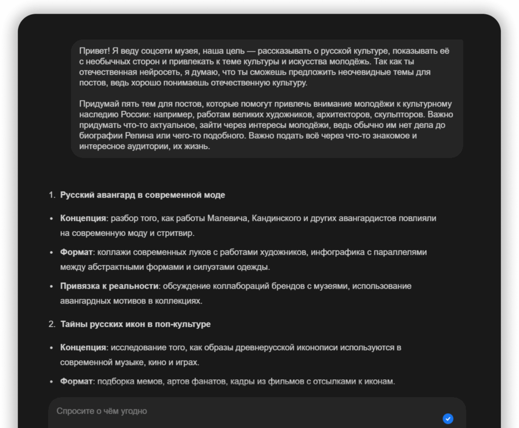 YaLM поможет привязать темы к отечественным реалиям — например, проанализировать, как русские иконы повлияли на поп-культуру