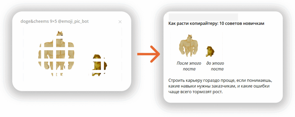 По умолчанию Телеграм позволяет прикреплять картинки только над или под постом — встроить их прямо в текст нельзя. Но если превратить изображение в набор эмодзи, можно буквально «вшить» его в публикацию. Такой формат выглядит непривычно, за счет чего сразу цепляет внимание читателя.