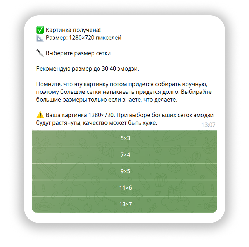 Когда бот загрузит файл, то предложит выбрать сетку — это количество фрагментов, на которые он нарежет изображение. Можно выбрать 5×3, 7×4, 9×5 и другие варианты. Чем больше сетка, тем детальнее получится итоговая картинка. Выберите масштаб, который подходит больше всего.