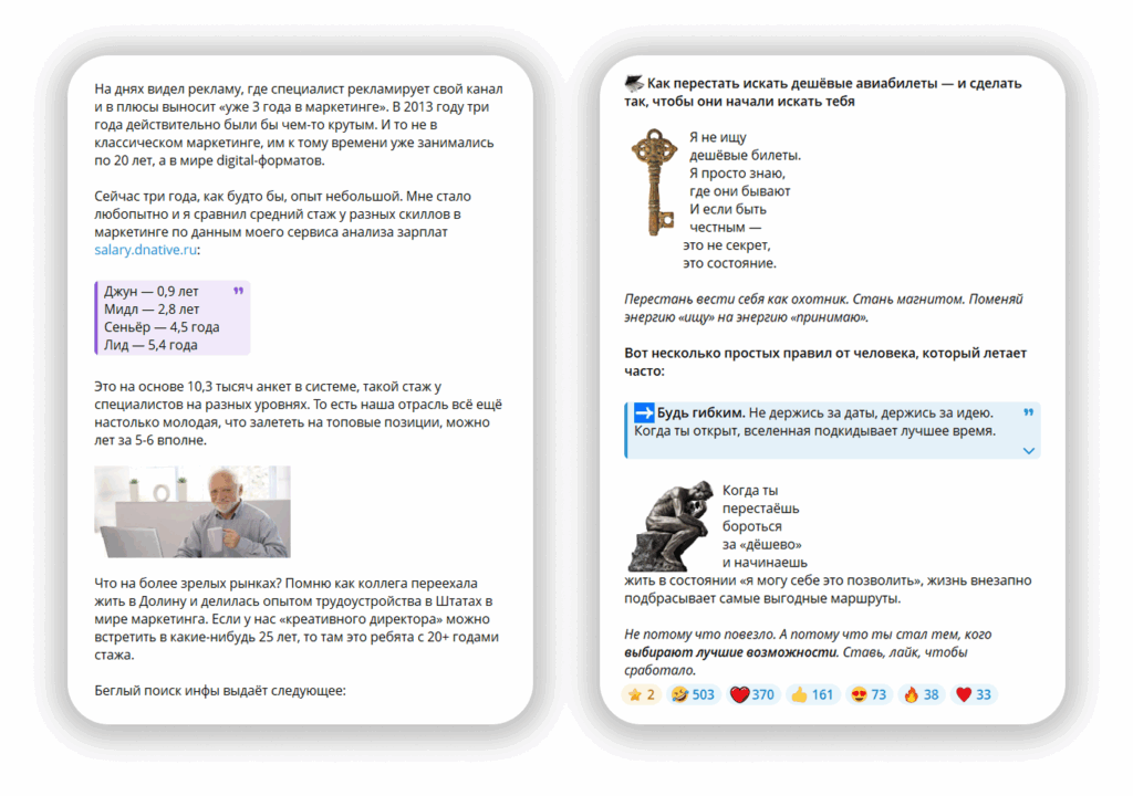 📌 Разбавить длинные посты. Если в лонгриде будет сплошной текст, читатель может его бросить. Но если добавить внутрь мем, схему или вставить фото эксперта — это создаст динамику, и пользователь с большей вероятностью дочитает до конца.