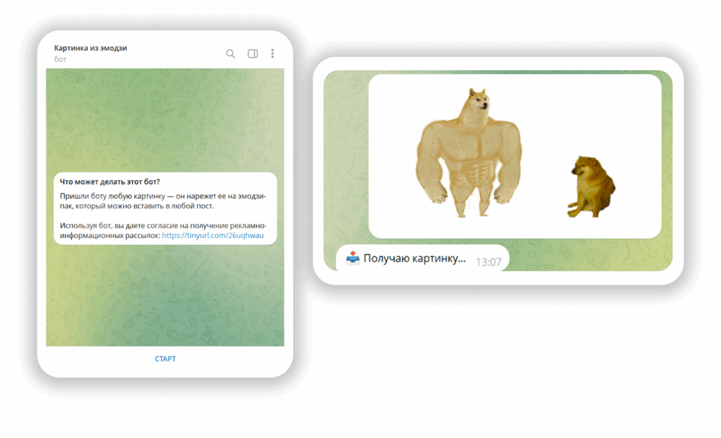 Перейдите в @emoji_pic_bot и нажмите «Старт». Затем отправьте ему изображение, которое хотите превратить в картинку из эмодзи. Бот принимает изображения в JPG и PNG, гифки и короткие видео до 3 секунд. Он сам определит формат и начнет обрабатывать иллюстрацию.