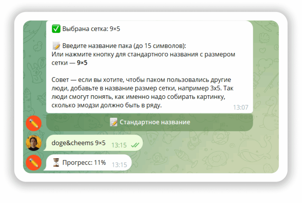 После выбора сетки бот попросит придумать название для эмодзи-пака. Это имя будут видеть все, кто откроет ваш набор или решит добавить его себе. Можно ввести любое название вручную или нажать кнопку «Стандартное название». Тогда бот сам подставит имя вроде picture_9x5.