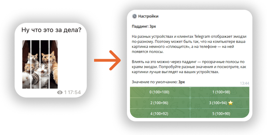 Важно учесть: Телеграм позволяет вставить в один пост не более 100 кастомных эмодзи. Это значит, что нельзя использовать сетку больше 10×10 — например, сделать картинку размером 12×9 (108 эмодзи).