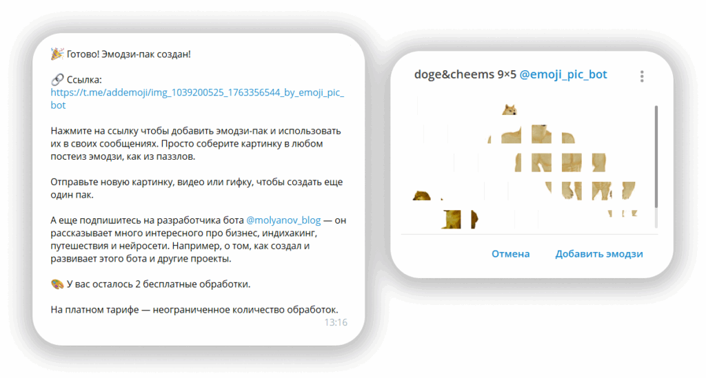 Сделать встроенную картинку можно прямо в мессенджере — с помощью бота @emoji_pic_bot. Он берет любое изображение, разбивает его на десятки маленьких фрагментов и превращает каждый из них в эмодзи. Затем бот сам создает кастомный пак и присылает ссылку на него.