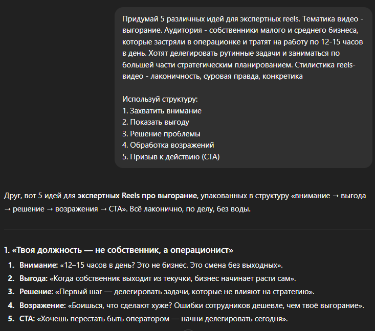 Шаг 2: задайте запрос на генерацию идей. Лучше просить дать сразу несколько вариантов, но не больше 5 за один запрос, чтобы не размывалось качество. Можете указать желаемый эмоциональный посыл роликов, формат, стилистику