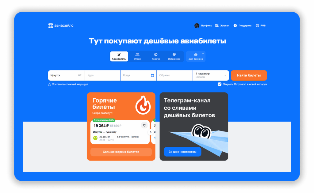 4. Основная функция продукта. Покупатели часто ищут решение одной, самой насущной проблемы. Покажите, что ваш товар или услуга идеально для этого подходят. Например, у сервиса для поиска авиабилетов ключевая задача — найти самый дешевый вариант, чтобы человек не сравнивал цены вручную. Если в вашем случае есть похожая центральная боль аудитории, покажите ее.