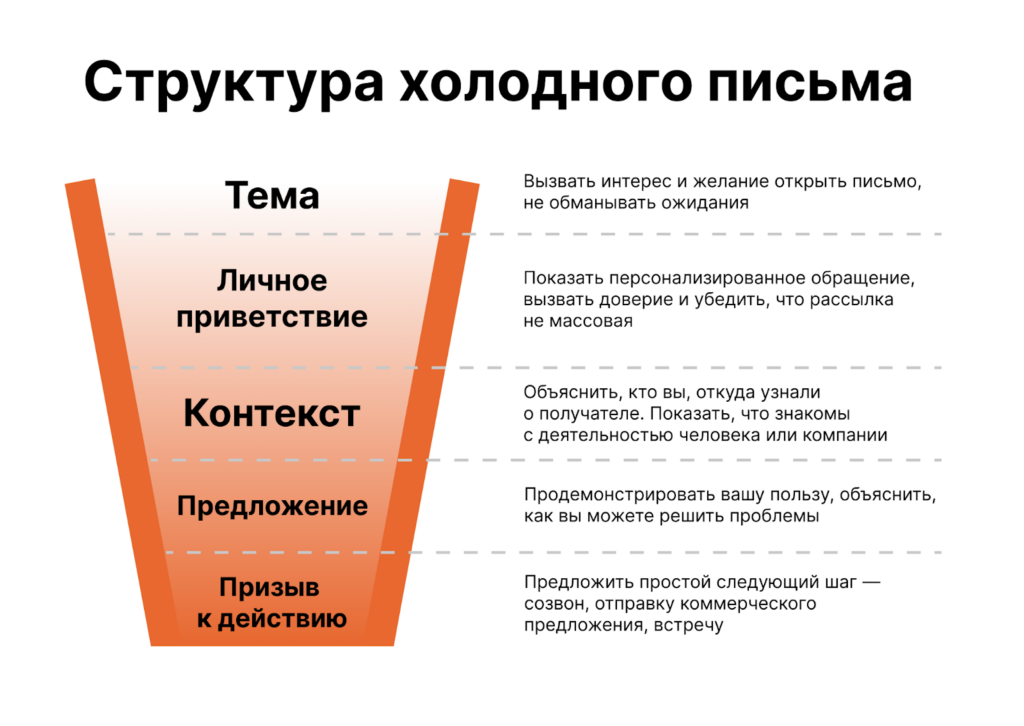 Эффективное холодное письмо можно представить в виде воронки. В начале оно должно заинтересовать получателя, затем объяснить, кто вы, и вызвать доверие. Только после этого — рассказать о полезном предложении и побудить к простому следующему шагу.
