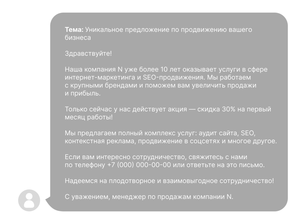 📌 Риск испортить репутацию. Если письмо слишком навязчивое, без конкретики или с ошибками — оно может вызвать у получателя негативное впечатление о компании. Так шансы на сотрудничество снизятся, даже если продукт или товар действительно полезен.