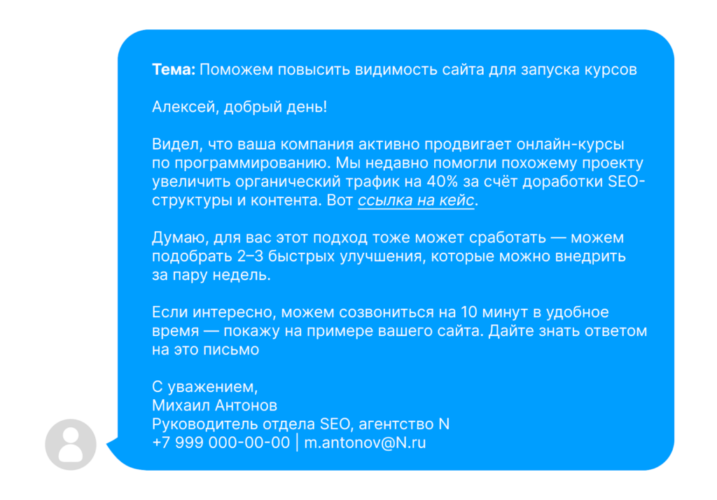 Чтобы разобрать принципы работы с рассылками на практике, рассмотрим два текста. Представим, что сотрудник SEO-отдела в агентстве пишет письмо потенциальным клиентам. Цель — побудить адресата к короткому разговору, в котором можно будет предложить подходящую услугу.