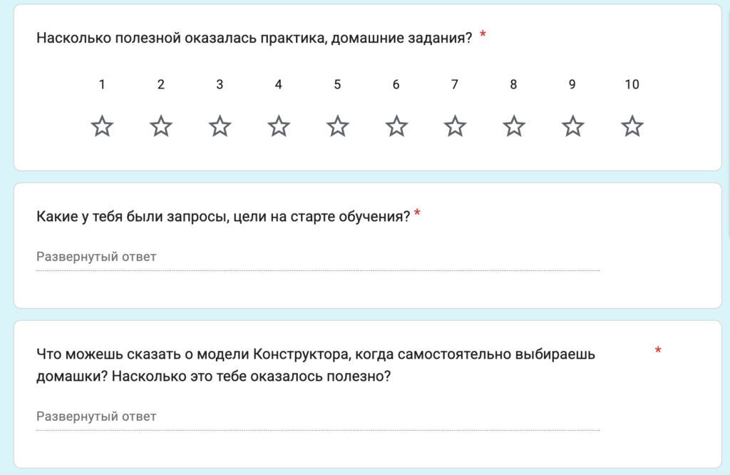 5–10 вопросов для быстрых опросов. Время заполнения 1–3 минуты;