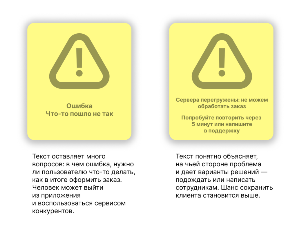 Пример. Вы хотите заказать еду в сервисе доставки, но из-за внутренних проблем он не отвечает. То, как копирайтер написал текст ошибки, может повлиять на ваши действия и настроение на вечер: