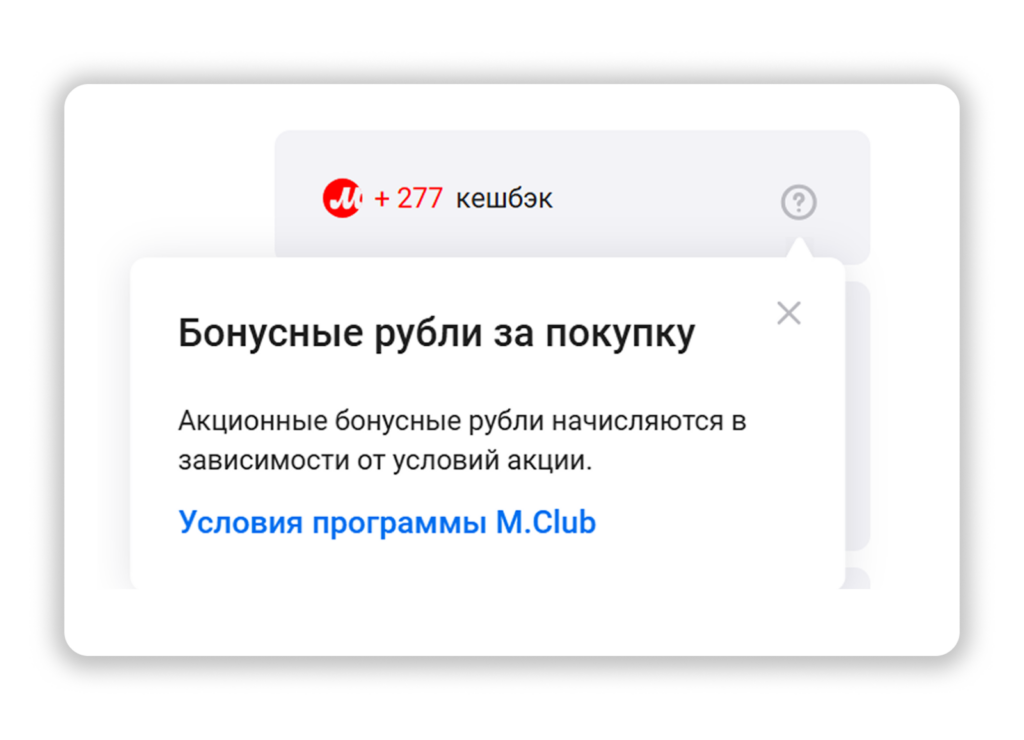 - Тултипы. Всплывающие подсказки, которые появляются при наведении на элемент интерфейса и раскрывают какие-либо подробности. Например, иконка с вопросительным знаком рядом с полем «Скидка» может раскрывать условия акции.