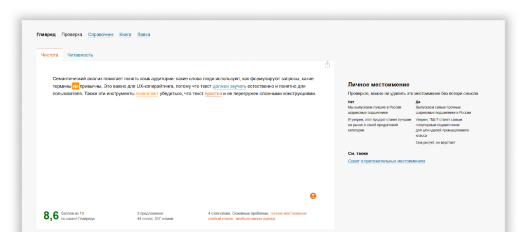 - Для проверки читаемости текста на русском — Text.ru, сервис «Главред» и «Орфограммка». Они оценивают сложность текста, указывают на канцеляризмы и длинные предложения, которые могут запутать пользователя.