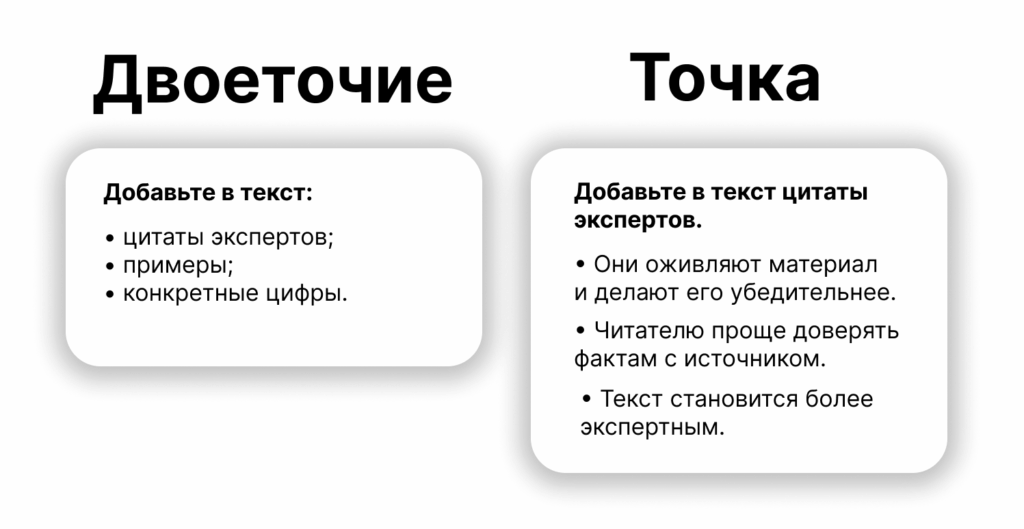 📌 Перед списком ставить двоеточие или точку. Двоеточие нужно, если предложение подводит к перечислению — например, содержит слова «следующее», «включает», «состоит из». Если предложение законченное и не предполагает продолжения, ставится точка.