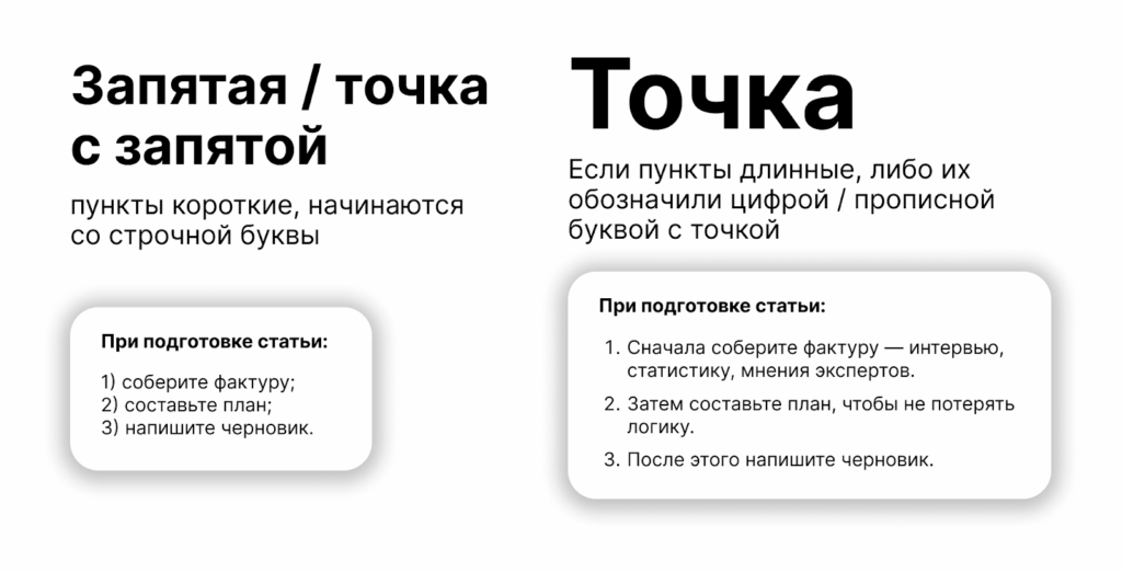 📌 После каждого пункта ставить знаки препинания. Их выбор зависит от того, как вы оформили сами перечни. Запятую или точку с запятой можно ставить, если пункты короткие и начинаются со строчной буквы. Тогда после последнего элемента списка нужно поставить точку.