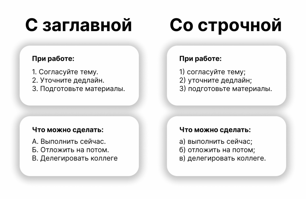 📌 Правильно ставить заглавные и строчные буквы. Пункт в списке начинается с заглавной, если перед ним идет цифра или буква с точкой. Со строчной — если оформление перечней начинается с буквы или цифры со скобкой.