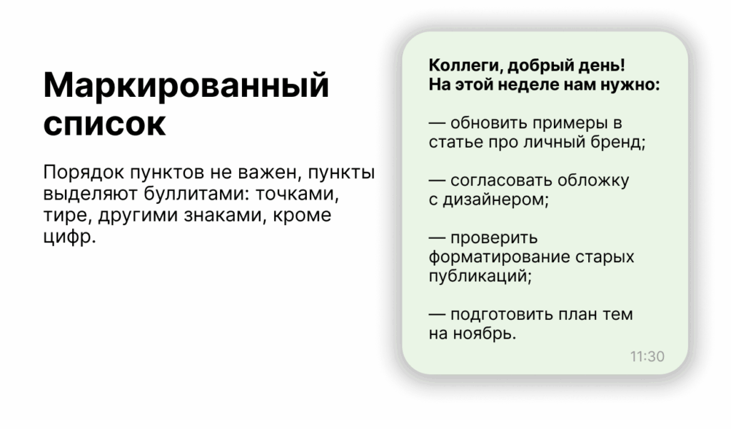 Его используют, когда в тексте есть перечисление элементов, но их порядок не важен. В таком случае пункты списка равнозначны — они показывают набор отдельных идей, а не последовательность действий.