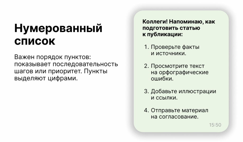 Его применяют, когда важно показать порядок действий. Нумерованный список помогает показать последовательность шагов, процесс или приоритет — что делать сначала, а что потом.