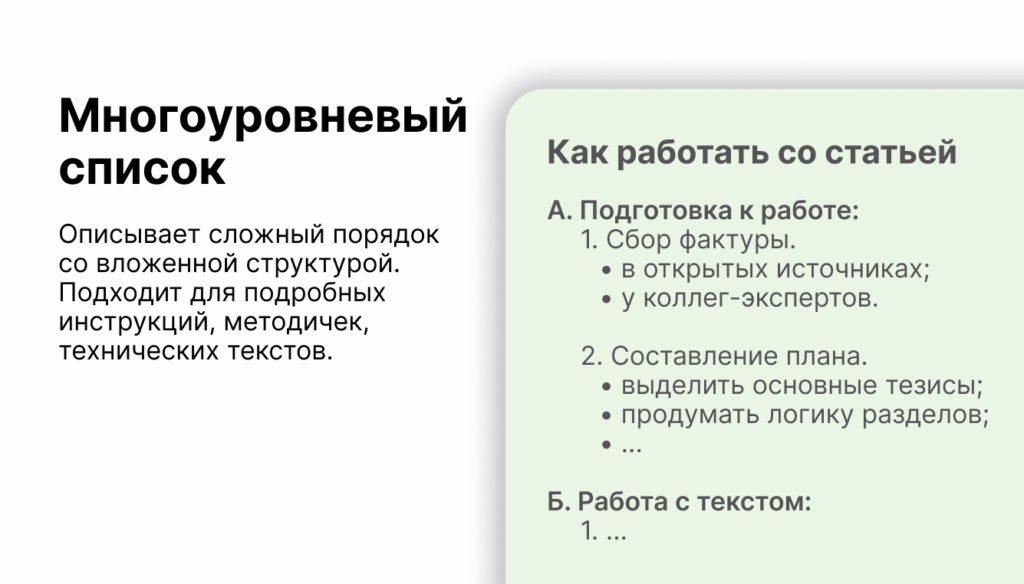 Их используют, если важно показать вложенность информации, пункты внутри пунктов. Такой формат позволяет структурировать сложные инструкции, методички, регламенты или большие технические тексты.