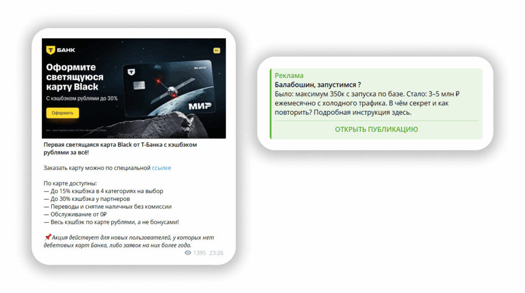 Не стоит путать этот формат с официальной рекламой Telegram Ads. Посев — рекламный пост, его публикует администратор канала, у которого купили размещение. Объявления Telegram Ads появляются внизу ленты и выглядят как баннеры с пометкой «Реклама».