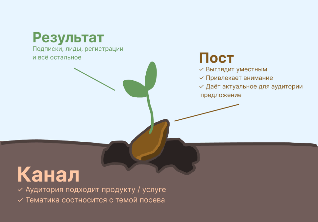 Канал можно представить как почву для посева: сообщество должно подходить по тематике, а аудитория — быть настоящей и активной. Семена — это пост. Он должен быть полезным аудитории, смотреться уместным, привлекать внимание, делать понятное и актуальное предложение. Тогда пойдет рост важных для вас показателей.