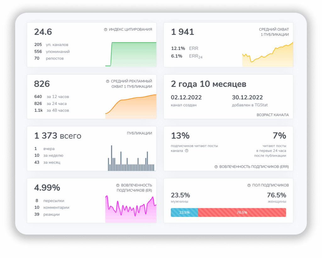 Также площадки стоит проверить на накрутку. Для этого используют специальные сервисы вроде TGStat. Например, они позволяют увидеть: