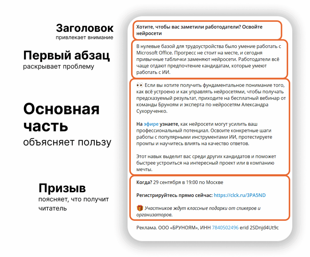 • Когда будете писать пост, помните: он должен подходить к формату канала, привлекать внимание заголовком или визуалом, объяснять пользу вашего продукта или услуги. Также важно сделать понятный призыв к действию — объяснить, зачем читателю его совершать.