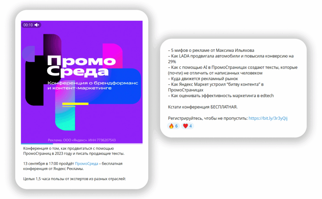 Пример 1: прямая реклама. Посев от Яндекса, помогает продвигать ПромоСреду — мероприятие для специалистов, которые работают с ПромоСтраницами. Пост дает только главную информацию: что за конференция, кому подойдет, что на ней будет. Яндекс не скрывает, что посев рекламный, не пытается маскироваться под нативные интеграции. Такой подход может сработать за счет прямоты, если коротко и понятно сформулировать предложение читателю.