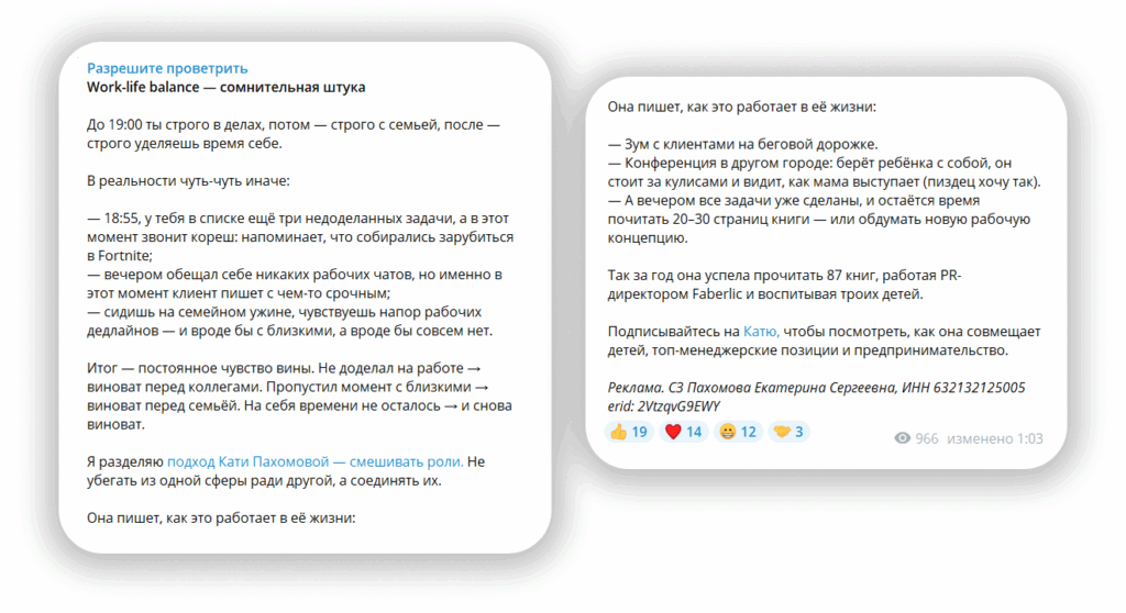 Пример 2: пост с личным мнением автора. Здесь рекламодатель договорился, чтобы автор сделал подводку к интеграции через собственные размышления. Такой вариант может хорошо сработать, ведь посев похож на обычный контент в канале. В результате аудитория воспринимает рекламу лояльнее, лучше на нее реагирует. Формат подходит, когда канал авторский, и подписчики доверяют мнению человека.