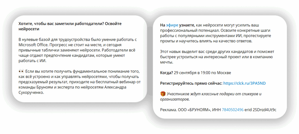Пример 3: нативный пост от лица рекламодателя. Бывает, что рекламодатель сам пишет завлекающий текст, а администратор канала только его выкладывает. Обычно его используют, когда хотят протестировать конкретный рекламный текст, и чужие подводки просто не нужны. Это вариант посередине: не прямая реклама, но и не нативная публикация от имени автора.