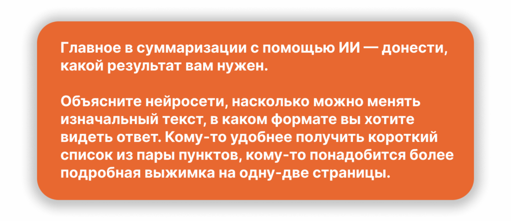 Экстрактивная. Алгоритм выбирает в исходном материале только главные фразы, а уточняющие и неважные — убирает. При таком способе сохраняются оригинальные формулировки. Удобно, если нужна гарантия, что нейросеть не придумает что-то от себя.
