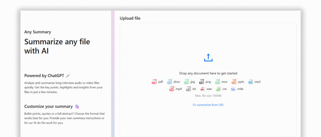 Благодаря функциям, Any Summary подходит и для быстрых обзоров, и для более детальных конспектов. Особенно полезен тем, кто работает с мультимедиа-контентом. В сервис можно загружать видео, презентации или подкасты — и сразу получать текстовую выжимку для статей, постов и сценариев.
