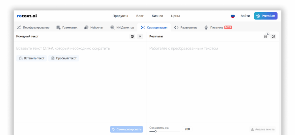 Нейросеть-редактор, которая сочетает несколько инструментов для улучшения текста. Помимо суммаризации здесь можно проверить орфографию и пунктуацию, сделать рерайт, повысить уникальность, выполнить SEO-анализ. Также ReText.AI умеет искать недостающие данные в открытых источниках.
